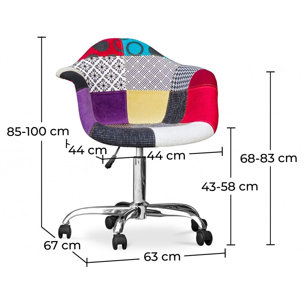 Vous êtes à la recherche d'une nouvelle chaise de bureau ? Et l'une de vos exigences est-elle qu'elle soit d'allure moderne ? Dans ce cas, celle-ci pourrait vous convenir. Son assise est belle et très moderne, avec un matériau rembourré en patchwork d'aspect vivifiant. Il se caractérise par toutes sortes de couleurs vives. C'est aussi un fauteuil relaxant, avec ses accoudoirs pratiques. Si vous voulez l'utiliser partout dans la maison, vous pouvez facilement le faire, car les pieds en acier sont munis de roues. Un siège pivotant et réglable en hauteur est un bonus supplémentaire.