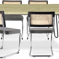 Ce pack composé d'une table à manger aux pieds en épingle à cheveux et de 6 chaises en bois avec une assise en velours est parfait pour les restaurants, les cafés et les hôtels. La table de style industriel a des pieds en épingle à cheveux qui lui donnent une touche moderne. Les 6 chaises de salle à manger ont un dossier en cannage fait à partir de rotin naturel, ce qui leur donne un style boho chic très particulier. L'assise en velours est douce et confortable, parfaite pour profiter d'un repas ou d'un verre en bonne compagnie.